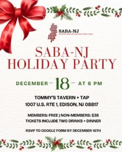 Please join us for SABA-NJ’s 2025 Holiday Party on December 18, 2026, from 6:00 p.m. to 9:00 p.m. at Tommy’s Tavern & Pub located at 1007 U.S.-1 in Edison, NJ.C