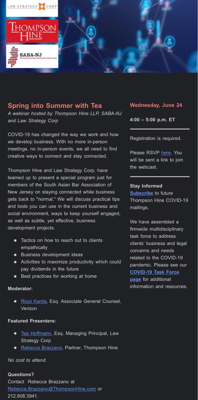 Join the South Asian Bar Association of New Jersey (SABA-NJ) together with Thompson Hine LLP and Law Strategy Corp for a webinar on staying connected during these unprecedented times. Moderated by SABA-NJ’s Executive Liaison Director Rippi Karda,