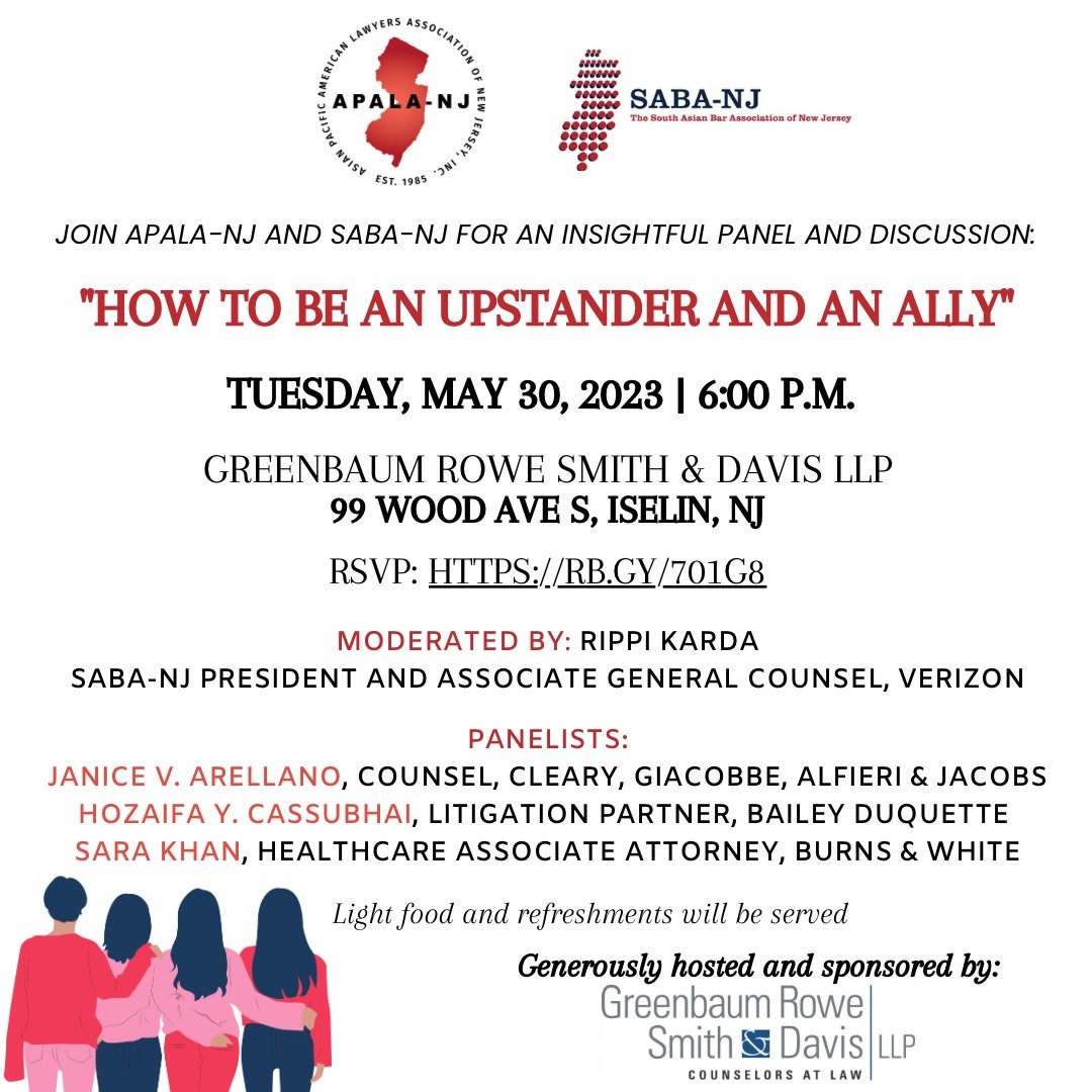 Greenbaum Rowe SMith & Davis 99 wood Aves, IselinPlease also join APALA-NJ and SABA-NJ for an insightful panel and discussion on how to be an upstander and an ally on Tuesday, May 30 at 6pm. SABA-NJ President Rippi Karda will moderate and will be joined by panelists Janice V. Arellano, Regional Representative Hozaifa Cassubhai and Director of Sponsorships Sara Khan. Thank you to […]