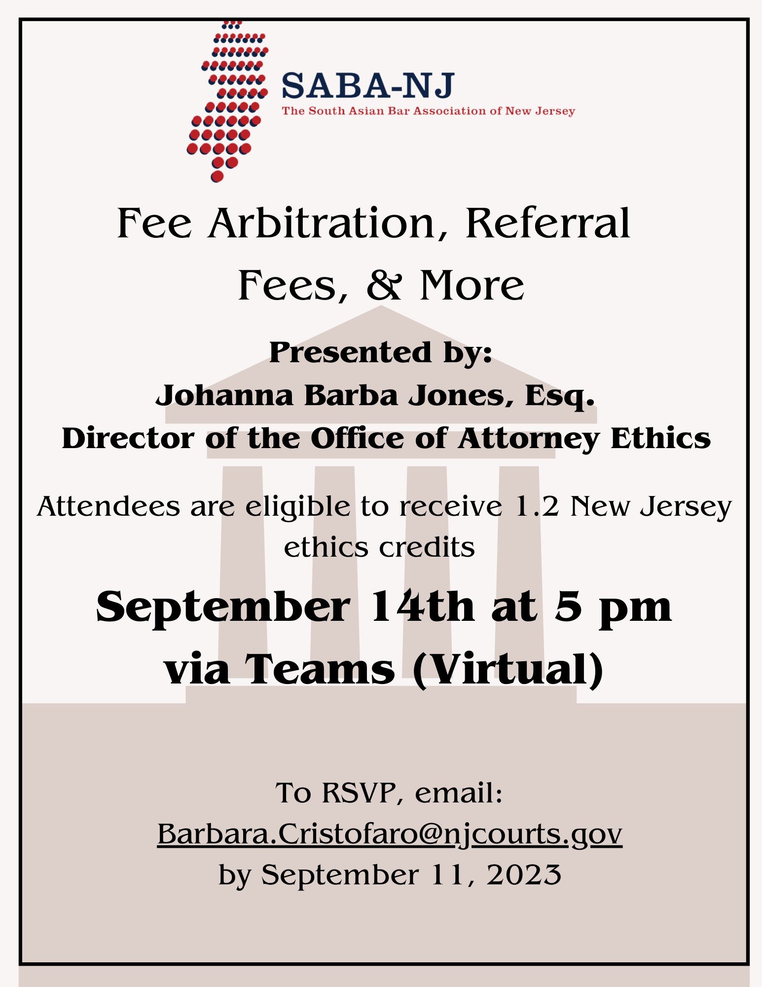 Virtual Meet NJPlease join SABA-NJ for Fee Arbitration, Referral Fees, & More presented by Johanna Barba Jones, Esq., Director of the Office of Attorney Ethics, on September 14 at 5 pm. All attendees are eligible to receive 1.2 New Jersey ethics credits. To RSVP please email Barbara.Cristofaro@njcourts.gov by September 11.