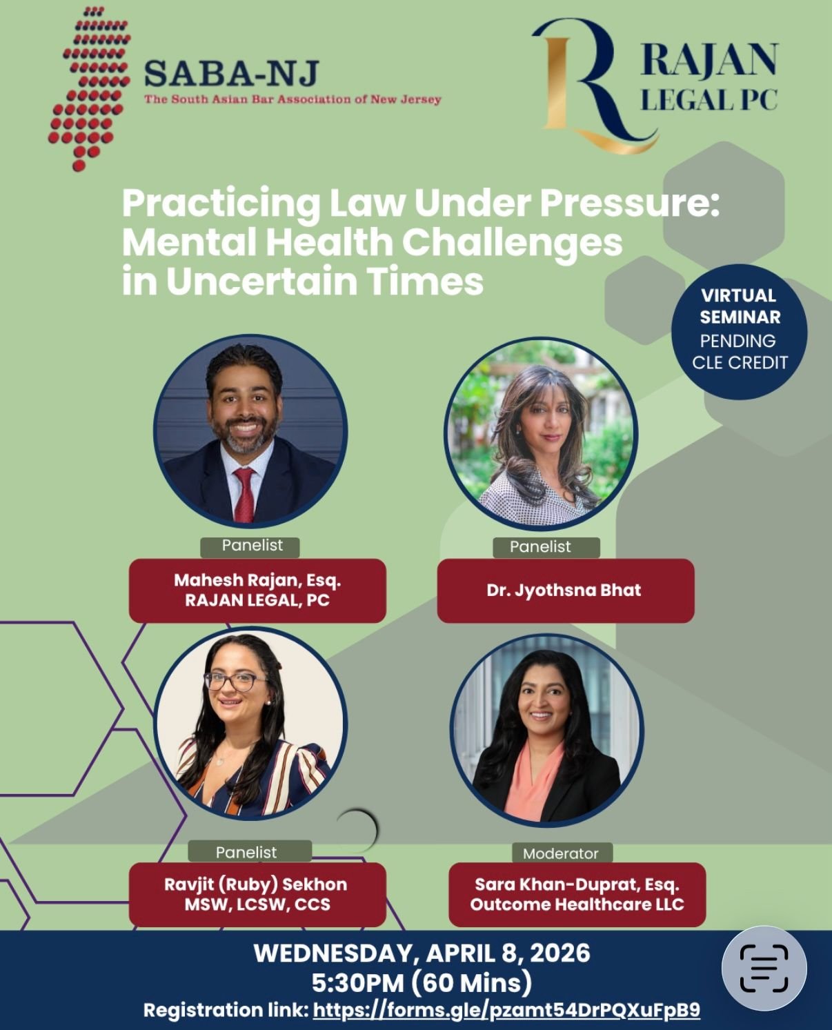 The South Asian Bar Association of New Jersey (SABA-NJ) is proud to present a virtual CLE program, "Practicing Law Under Pressure: Mental Health Challenges in Uncertain Times.” This program will address the increasing mental health challenges faced by legal professionals and provide meaningful insights on navigating stress in today’s evolving landscape. The pressures of […]
