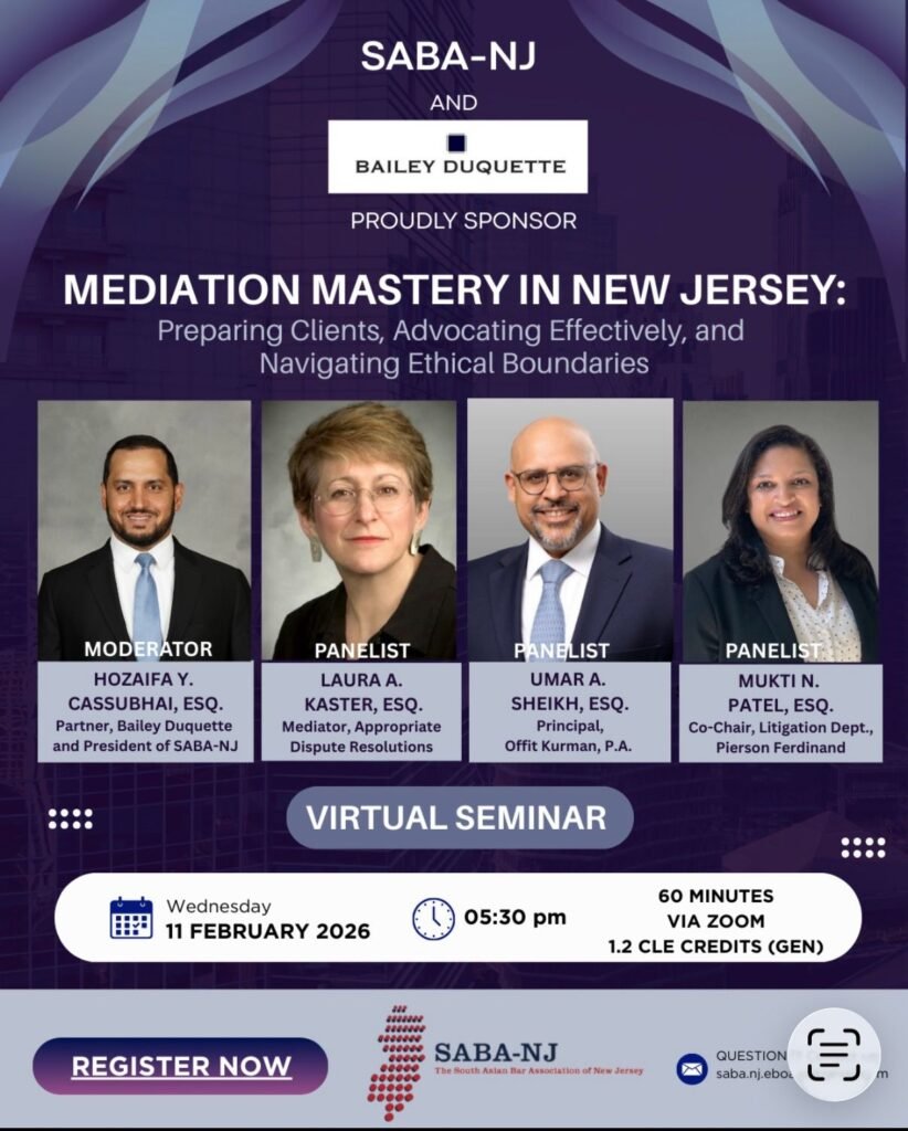 SABA-NJ is proud to present “Mediation Mastery in New Jersey: Preparing Clients, Advocating Effectively, and Navigating Ethical Boundaries.” This virtual seminar is sponsored by Bailey Duquette P.C. Join us for […]